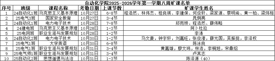 现将自动化学院2025-2026学年第一学期8周课堂缺勤情况公示如下: