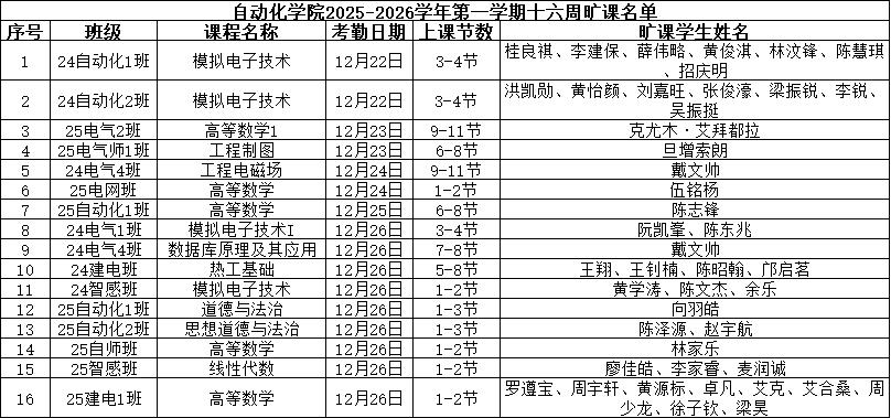 现将自动化学院2025-2026学年第一学期16周课堂缺勤情况公示如下: