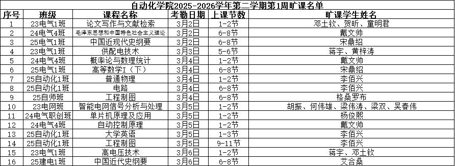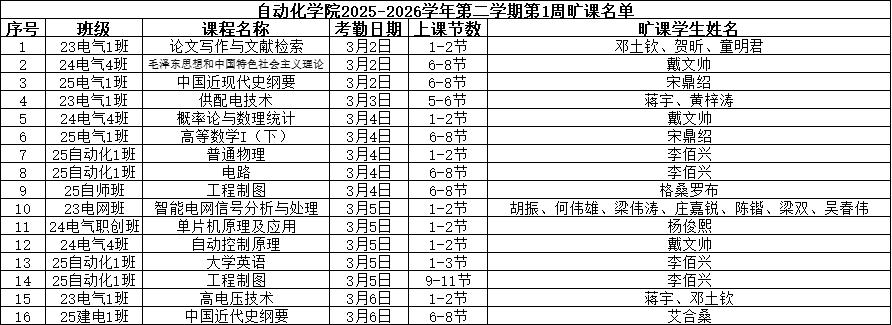 现将自动化学院2025-2026学年第二学期第1周课堂缺勤情况公示如下: