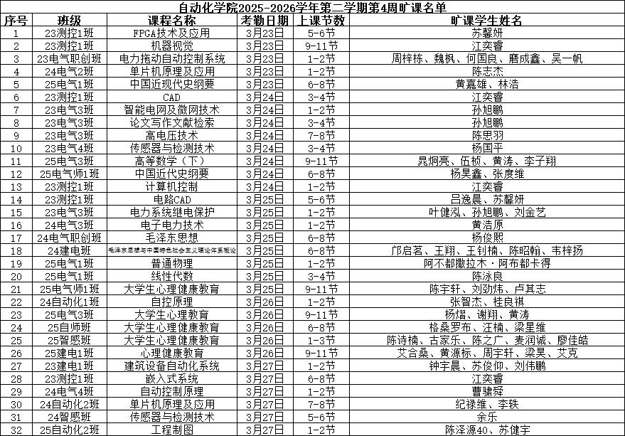 现将自动化学院2025-2026学年第二学期第4周课堂缺勤情况公示如下: