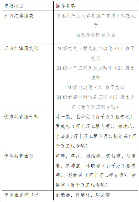 关于自动化学院2025-2026年度广东技术师范大学五四评优推荐名单的公示