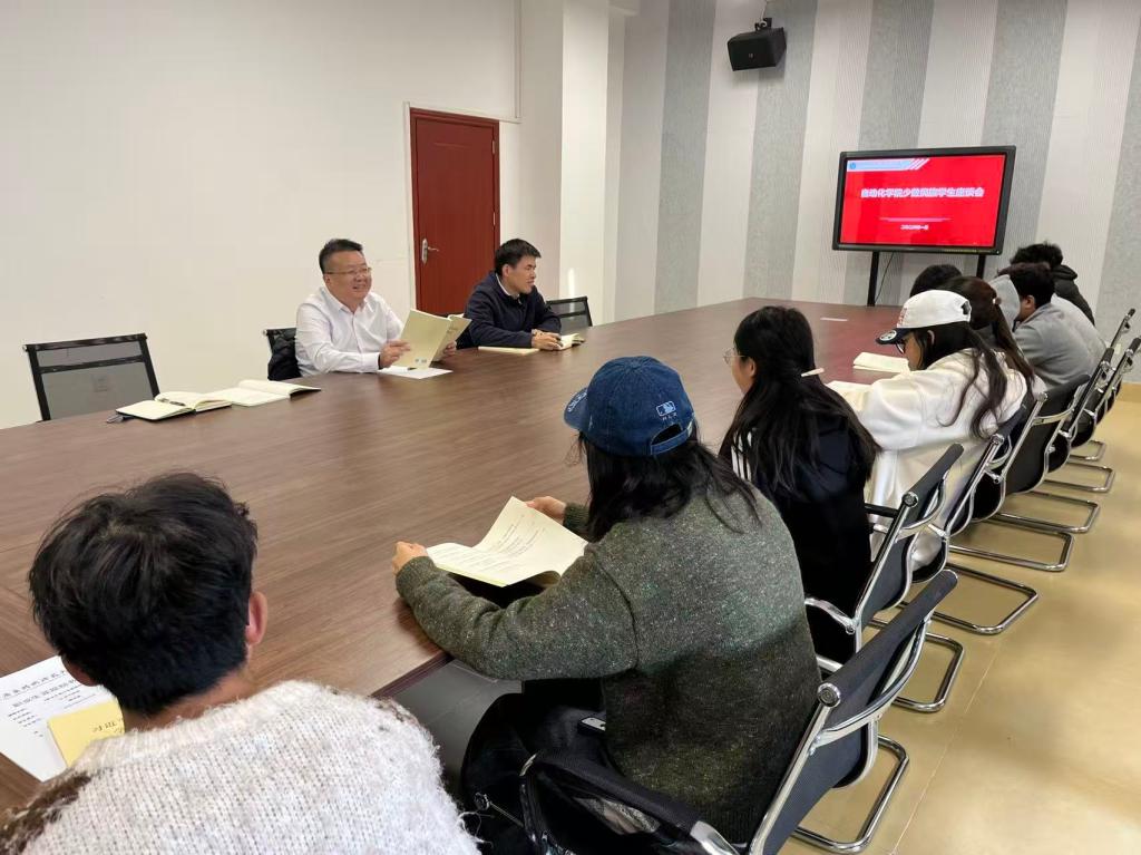 1月13日,自动化学院党委副书记蒋鹏在河源校区求新楼611主持召开2025级少数民族学生座谈会,并向参会同学赠送《习近平文化思想学习纲要》一书。