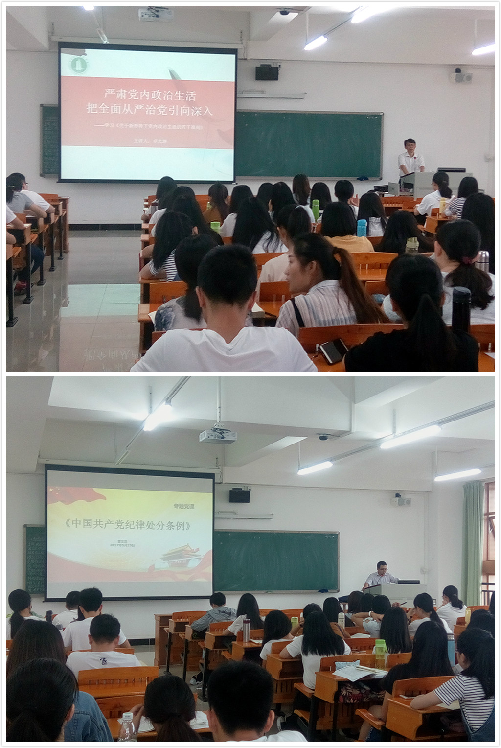 本次集中培训分为两场,第一场由卓光琳书记就《关于新形势下党内政治生活的若干准则》为主题并以严肃党内政治生活、把全面从严治党引向深入为导向对发展对象进行了培训。卓光琳老师讲解了制定该《准则》的背景;党内政治生活出现的一些突出问题:包括理想信念不坚定、对党不忠诚、滥用权力等;该《准则》的主要内容:从根本准则、主要目标、基本内容这三个方面进行讲解等,并强调了坚定理想信念的重要性及发展对象应熟悉党章。第二场专题党课培训由曾志浩副教授从六个方面对《中国共产党纪律处分条例》进行了讲解,包括:党员的不合格表现、党纪与国法的衔接、把政治纪律放在首要位置、明确可依的负面清单等。最后曾志浩老师通过对《中国共产党纪律处分条例》原文的解读,让发展对象对党的纪律及处分有一个更加清晰的认识。
