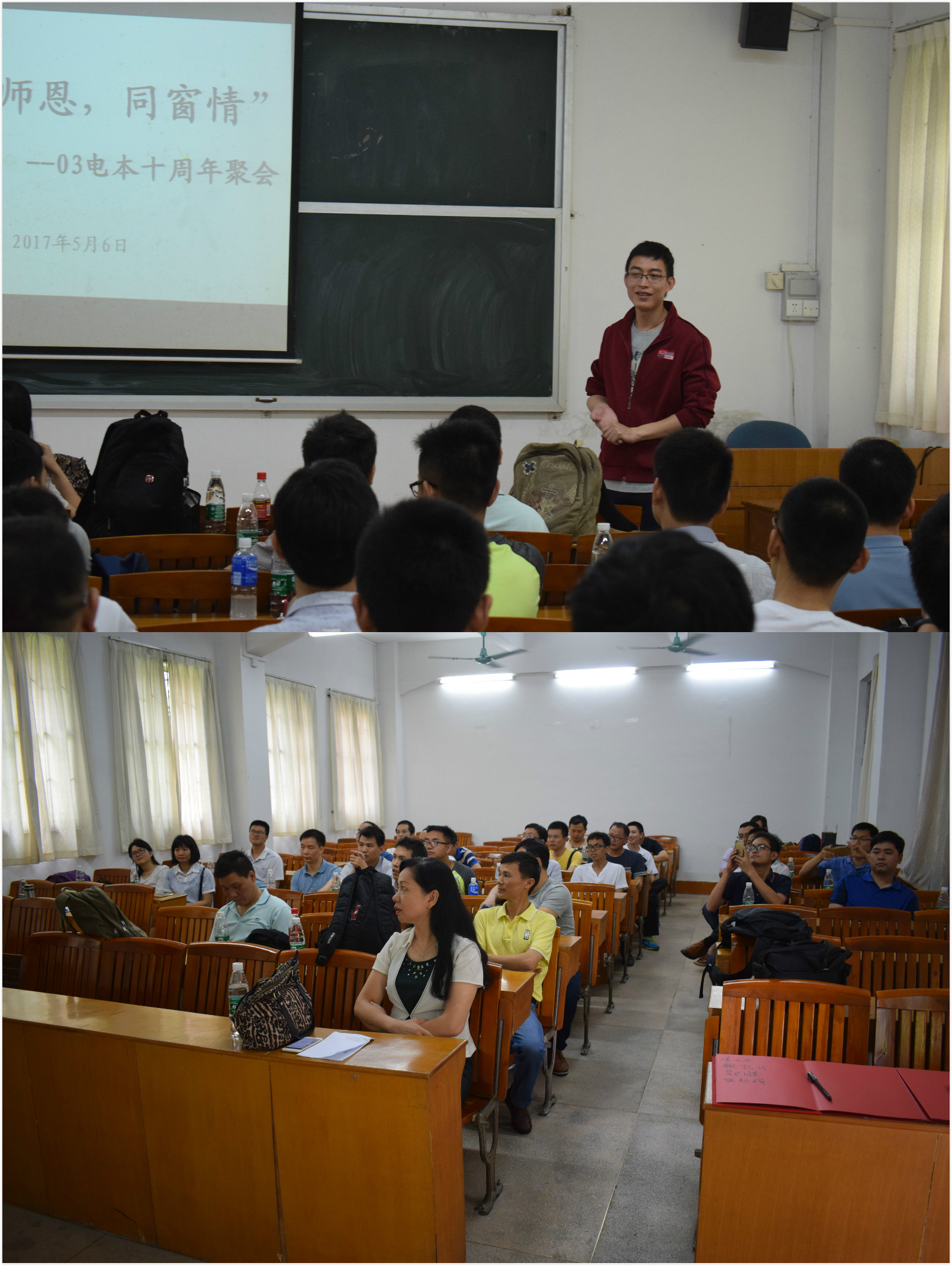 上午十点半,03级电本班的校友们陆续来到十周年聚会的多媒体教室。见到昔日的恩师,一起疯狂过的同学,笑容很自然地就洋溢在脸上了,握手、搭肩、拥抱…仿佛大学的青葱时光就在昨日,依然有说有笑地,谈一谈近来发展,聊一聊旧日年华。
