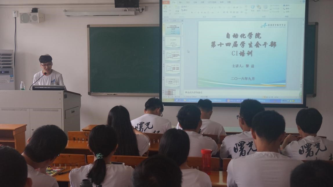 而黎益师兄在致词中表示,感谢全体干部在过去一年的辛勤付出,自动化学院学生会在校团委、校学生会的正确指导下以及全体干部的配合之下,成功开展了一件件丰富学院乃至全校学生课余生活的系列活动,他希望干部们能借此培训机会,努力提升自我素养,从而更好地促进同学的全面发展。最后,他要求全体干部要努力成为一名 “站起来能讲、坐下来能写、动起来能干、静下来能想”的四能干部。本期干部培训的第一节课程培训便是自动化学院学生会独有的CI手册(企业形象识别系统)培训了,黎益师兄详尽介绍了CI手册的三大系统分别是MI系统——理念识别、BI系统——行为识别、VI系统——视觉识别,经过培训,大家明白了学习CI手册更重要的是要把所学到的知识运用到实际工作中去。