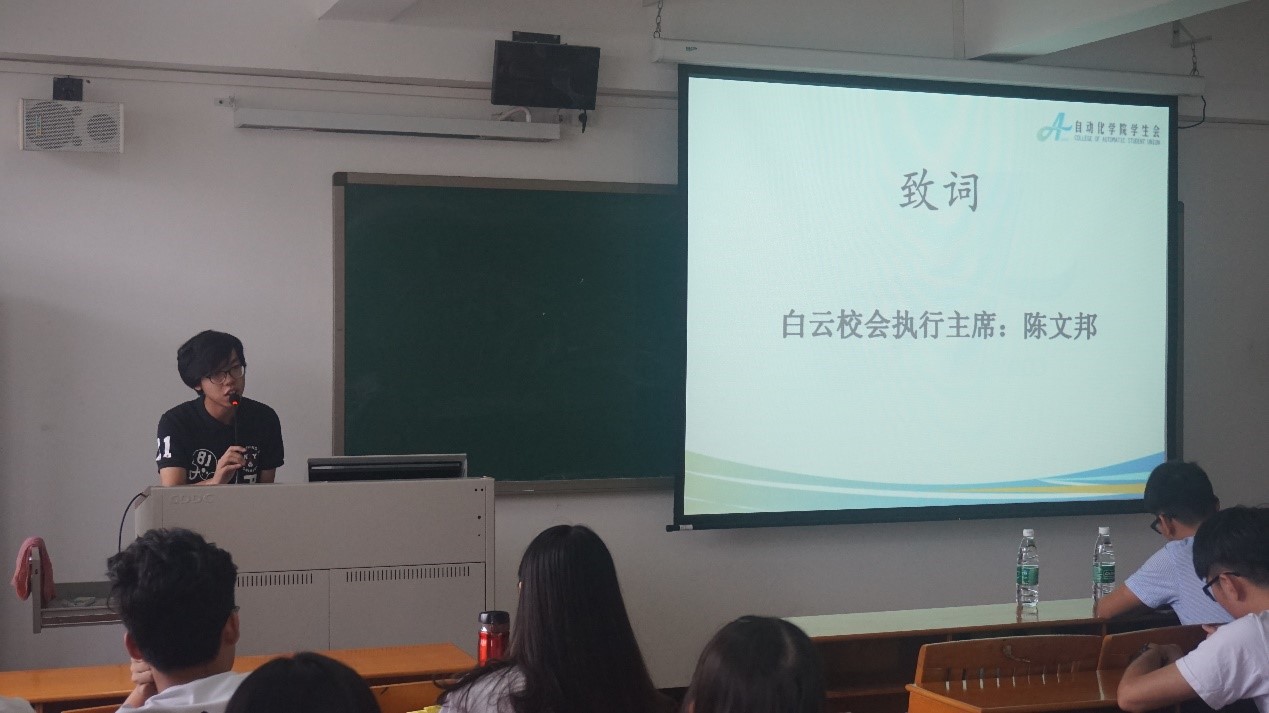 士不可以不弘毅,任重而道远。为了增强自动化学院学生会干部的个人素质及工作能力,自动化学院学生会于9月4日在三教510举行第十四届学生会干部开班仪式。本次培训我们有幸邀请到了白云校区校学生会的执行主席陈文邦师兄、副主席李钊华师兄出席本次活动。