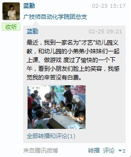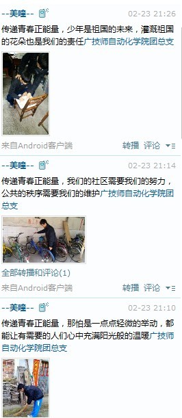 30多天的假期眨眼而过,同学们迎来了新的学期,新学期同学们不仅带来了他们的特产更是带来了他们寒假社会实践活动的成果,当代大学生肩负着社会责任和历史重任,作为十八大精神的深入宣传者、积极倡导者和忠实践行者。他们都利用了寒假返乡的机会,以百姓喜闻乐见的方式宣传大昂的十八大精神,进一步增强人民群众学习贯彻落实党的十八大精神的自觉性和坚定性。在开学报到注册时共收到作业867份,其中有497份采用了在腾讯微博上发微博记录自己完成寒假作业过程的这一新颖形式,而剩余的同学则采用了传统的作文形式记录下了自己的寒假实践活动的点滴。自动化学院团总支将对寒假社会实践活动进行评选,并选取部分优秀作品进行展示。